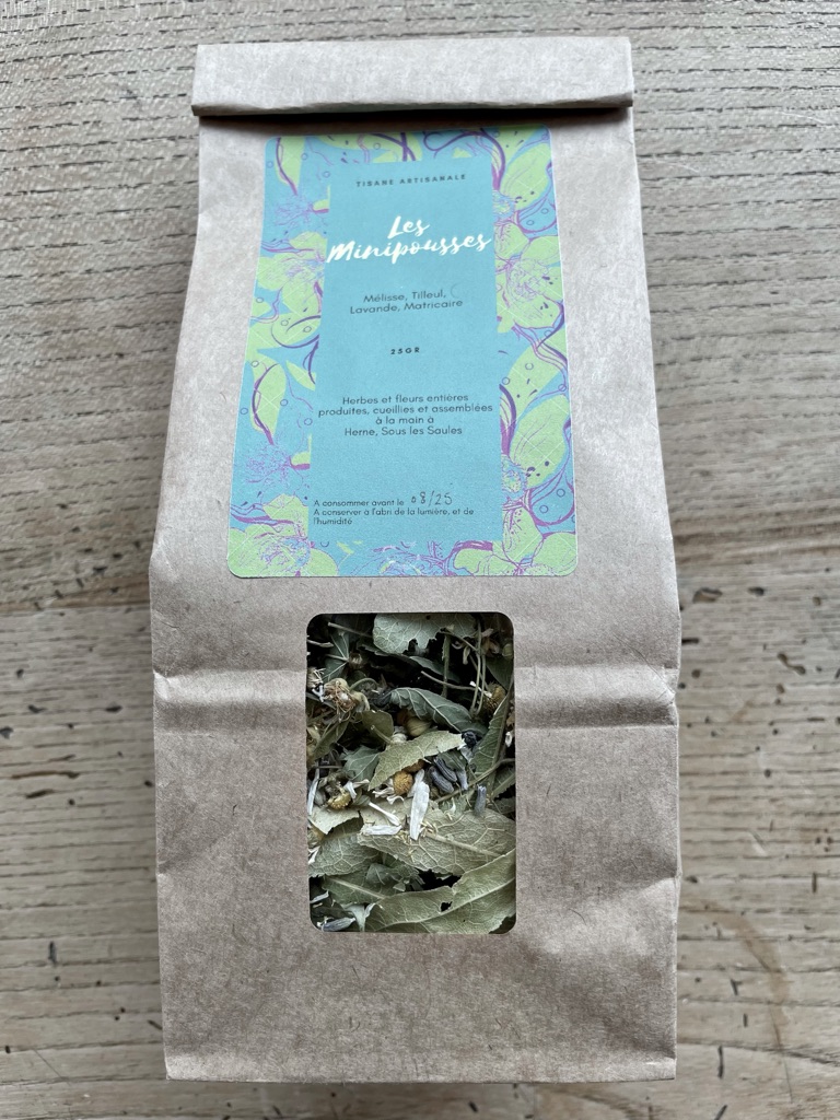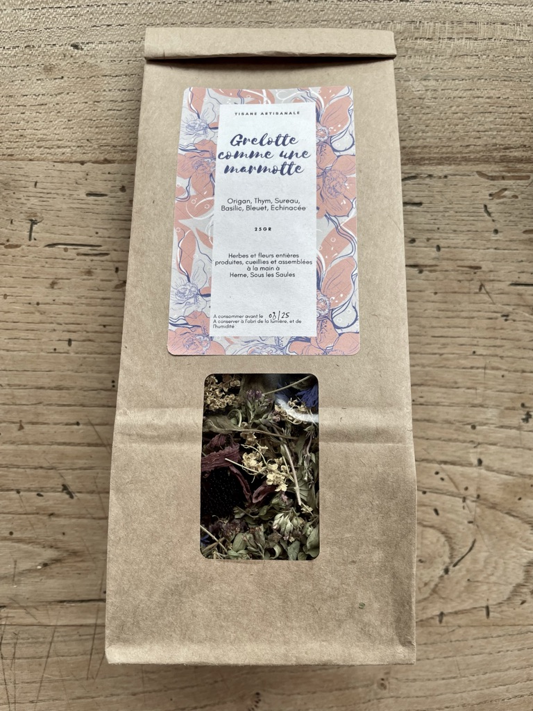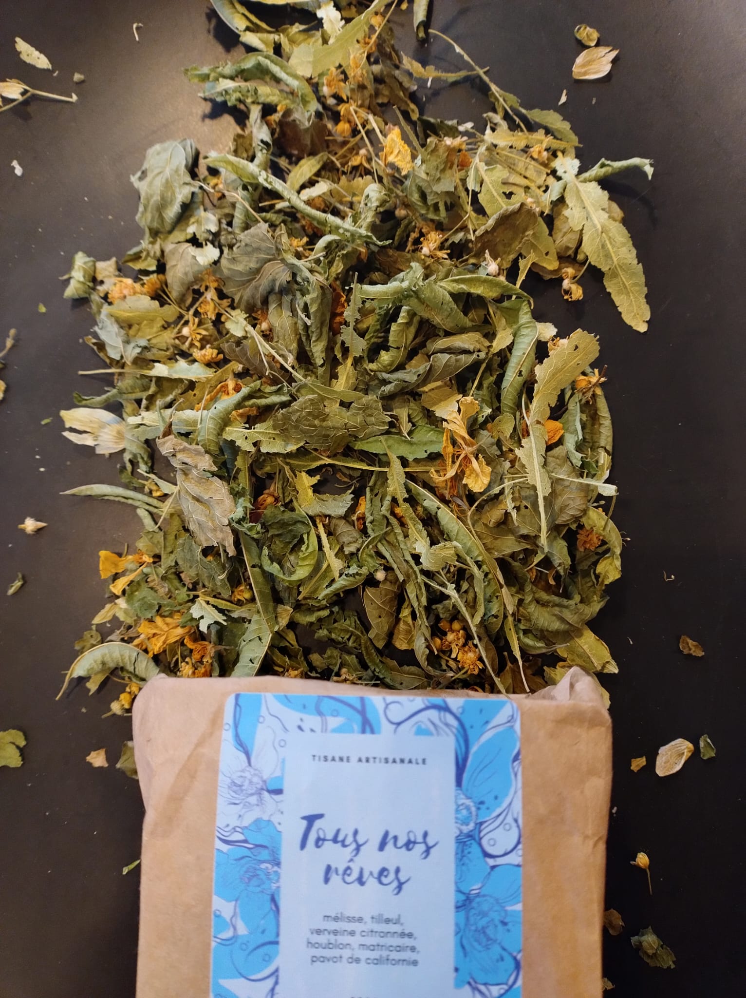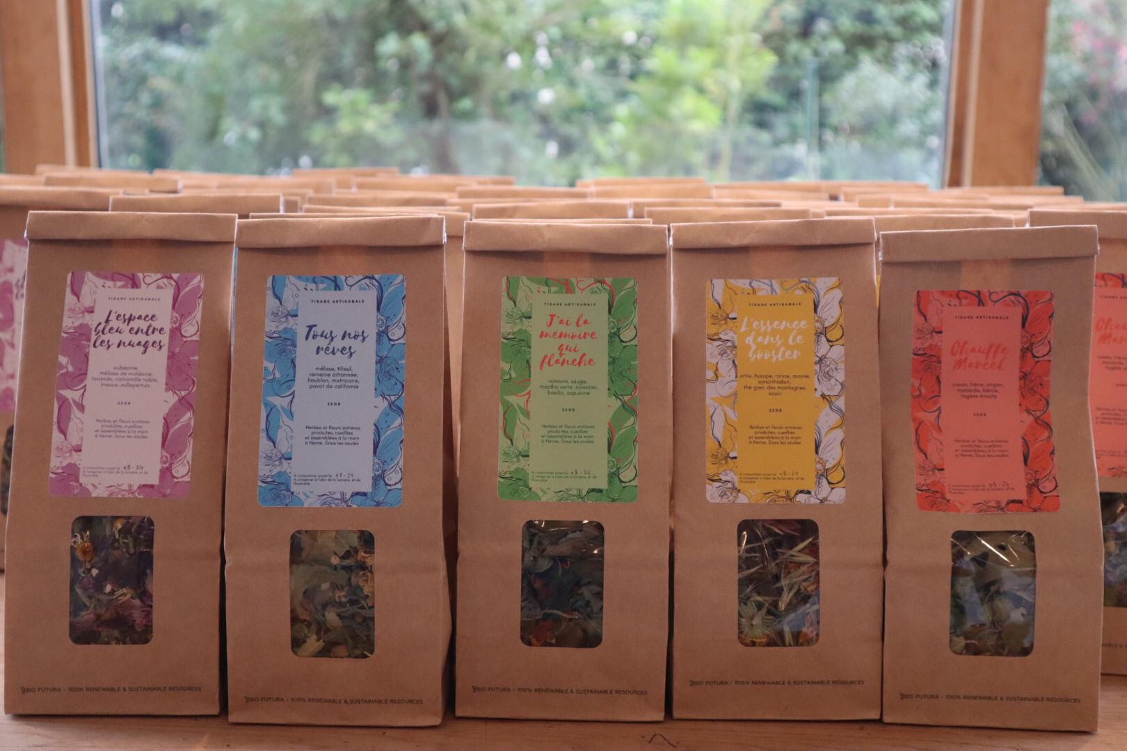 Les tisanes sont des mélanges composés de feuilles et de fleurs aromatiques et médicinales issues du champ-potager. Une trentaine de plantes sont cultivées en plein champ et sous serre. La cueillette sauvage complète la culture des annuelles et vivaces. Les plantes sont cultivées sous serre et en plein champ. Elles sont récoltées à la main et séchées sur claies, à basse température en 3 à 5 jours, dans un séchoir artisanal sur le potager. Les tisanes sont élaborées à partir des vertus des plantes et de leurs saveurs aromatiques.
