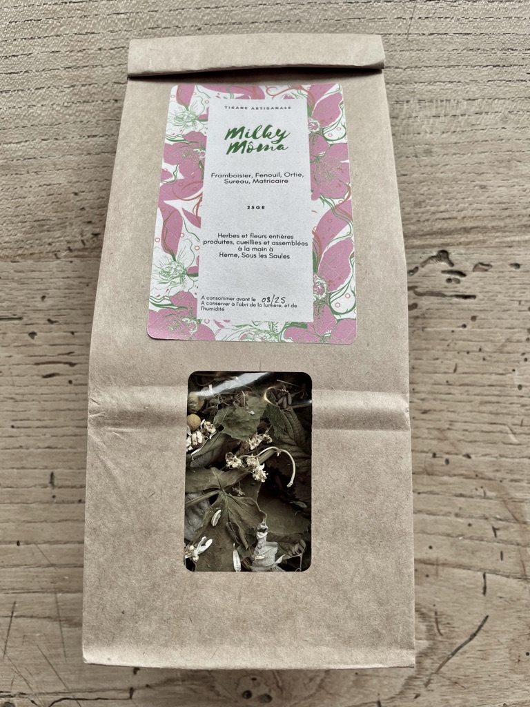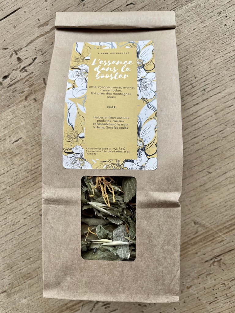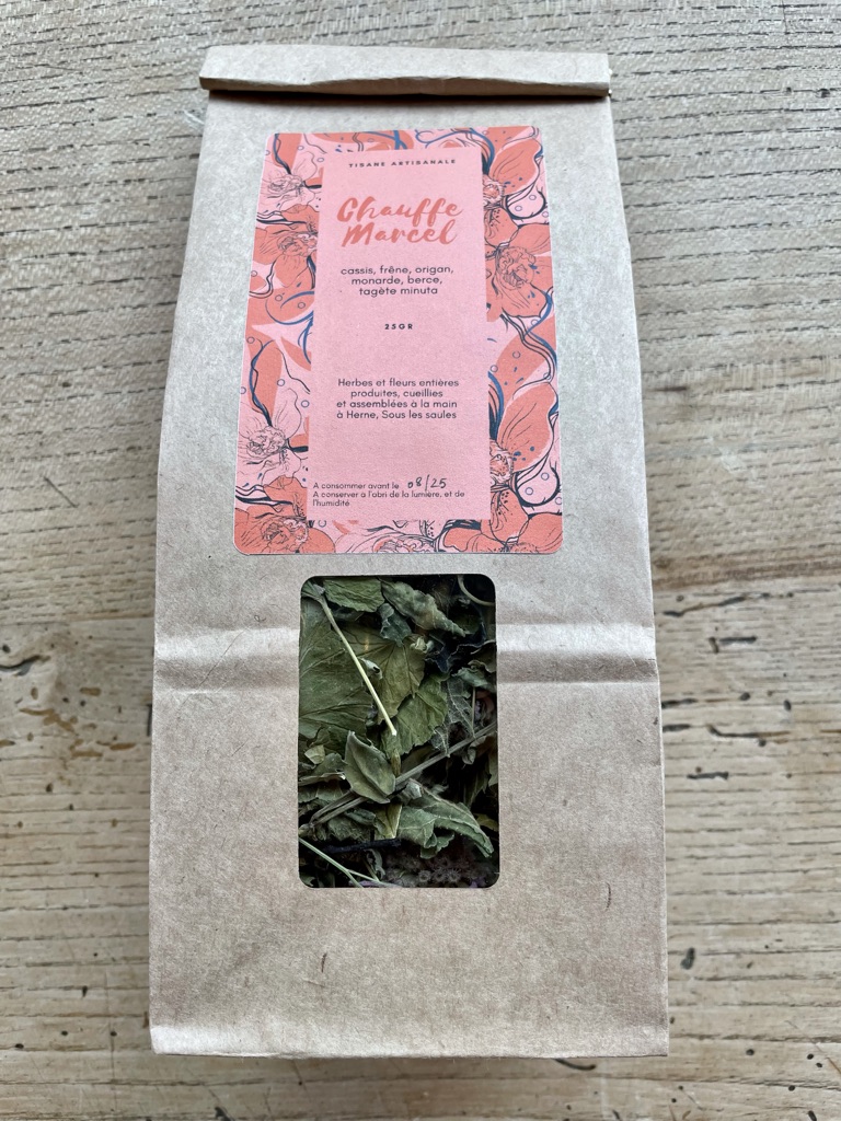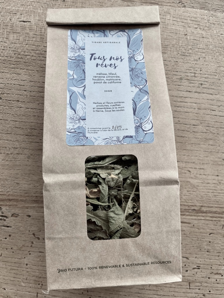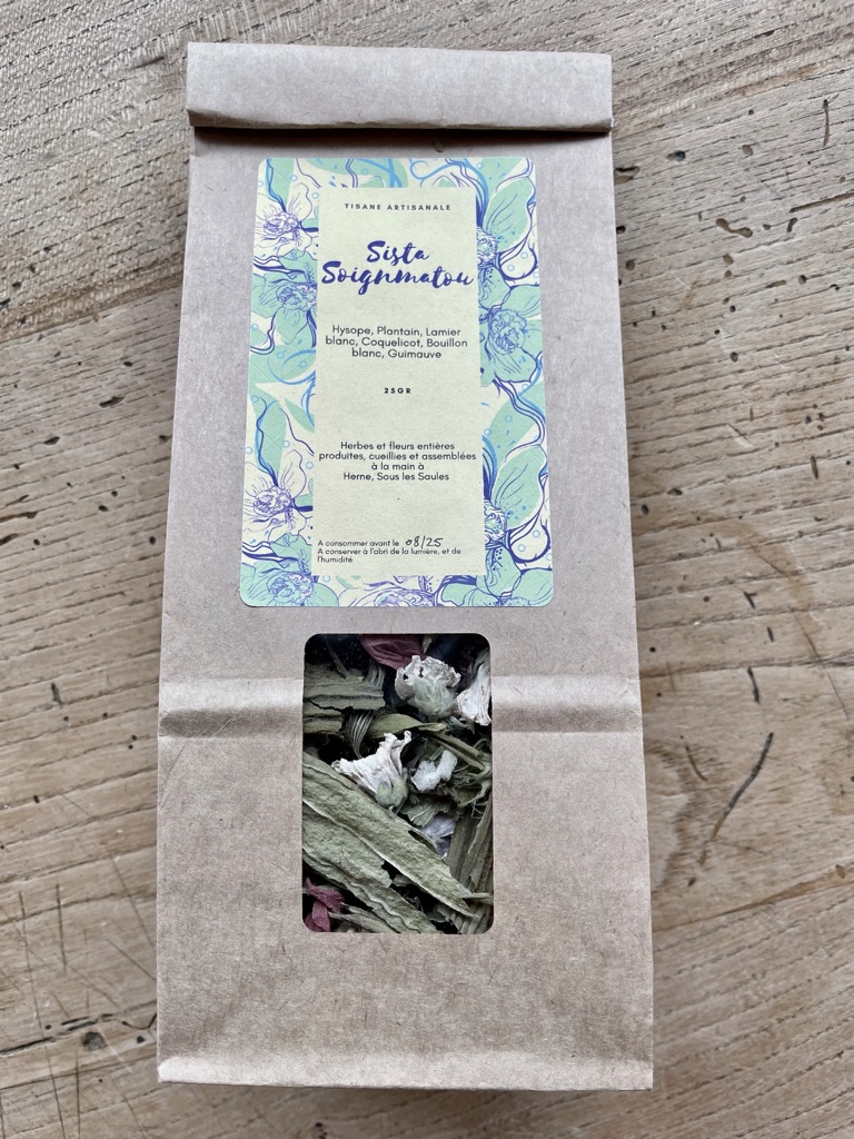 Les tisanes sont des mélanges composés de feuilles et de fleurs aromatiques et médicinales issues du champ-potager. Une trentaine de plantes sont cultivées en plein champ et sous serre. La cueillette sauvage complète la culture des annuelles et vivaces. Les plantes sont cultivées sous serre et en plein champ. Elles sont récoltées à la main et séchées sur claies, à basse température en 3 à 5 jours, dans un séchoir artisanal sur le potager. Les tisanes sont élaborées à partir des vertus des plantes et de leurs saveurs aromatiques.