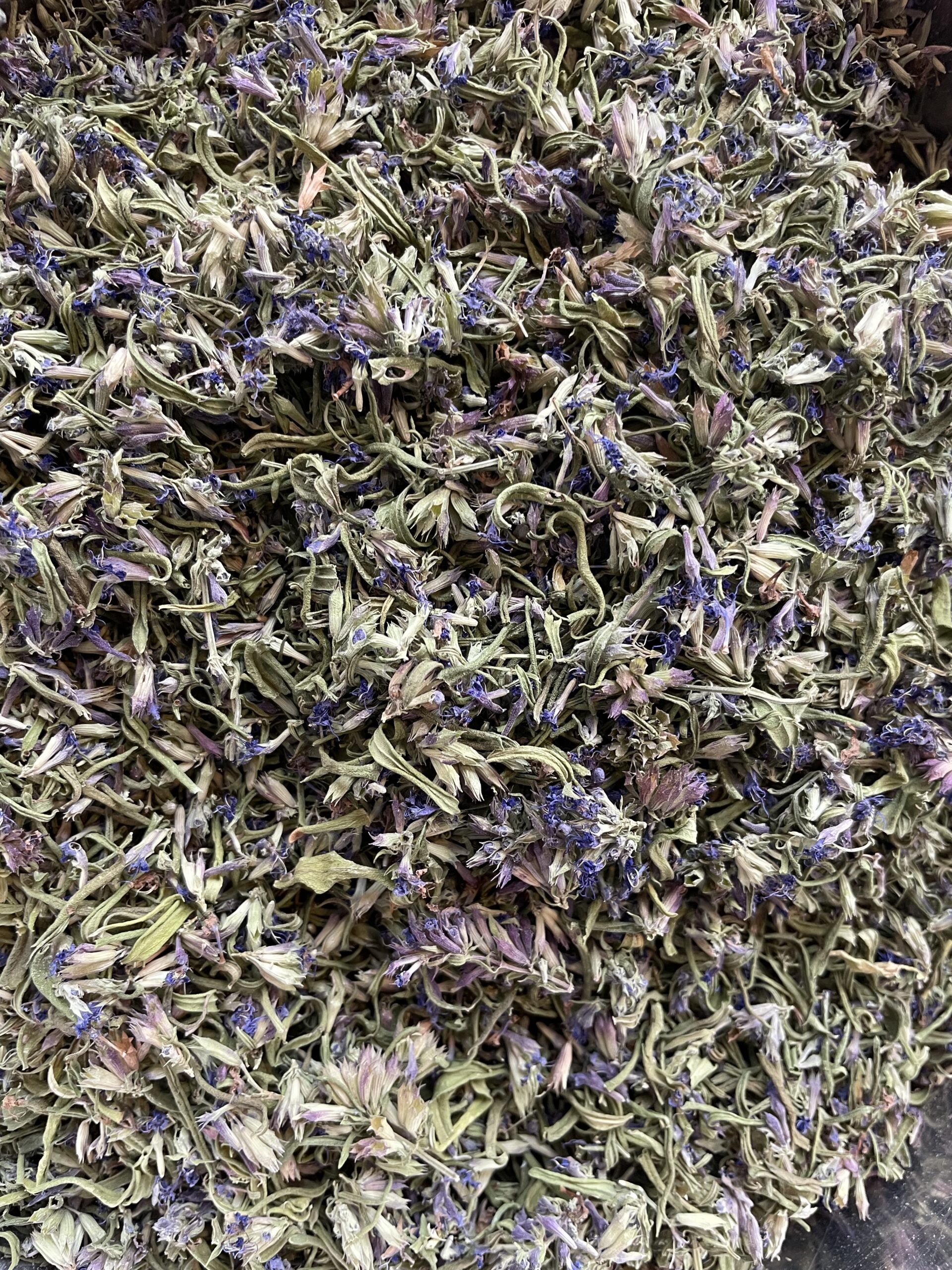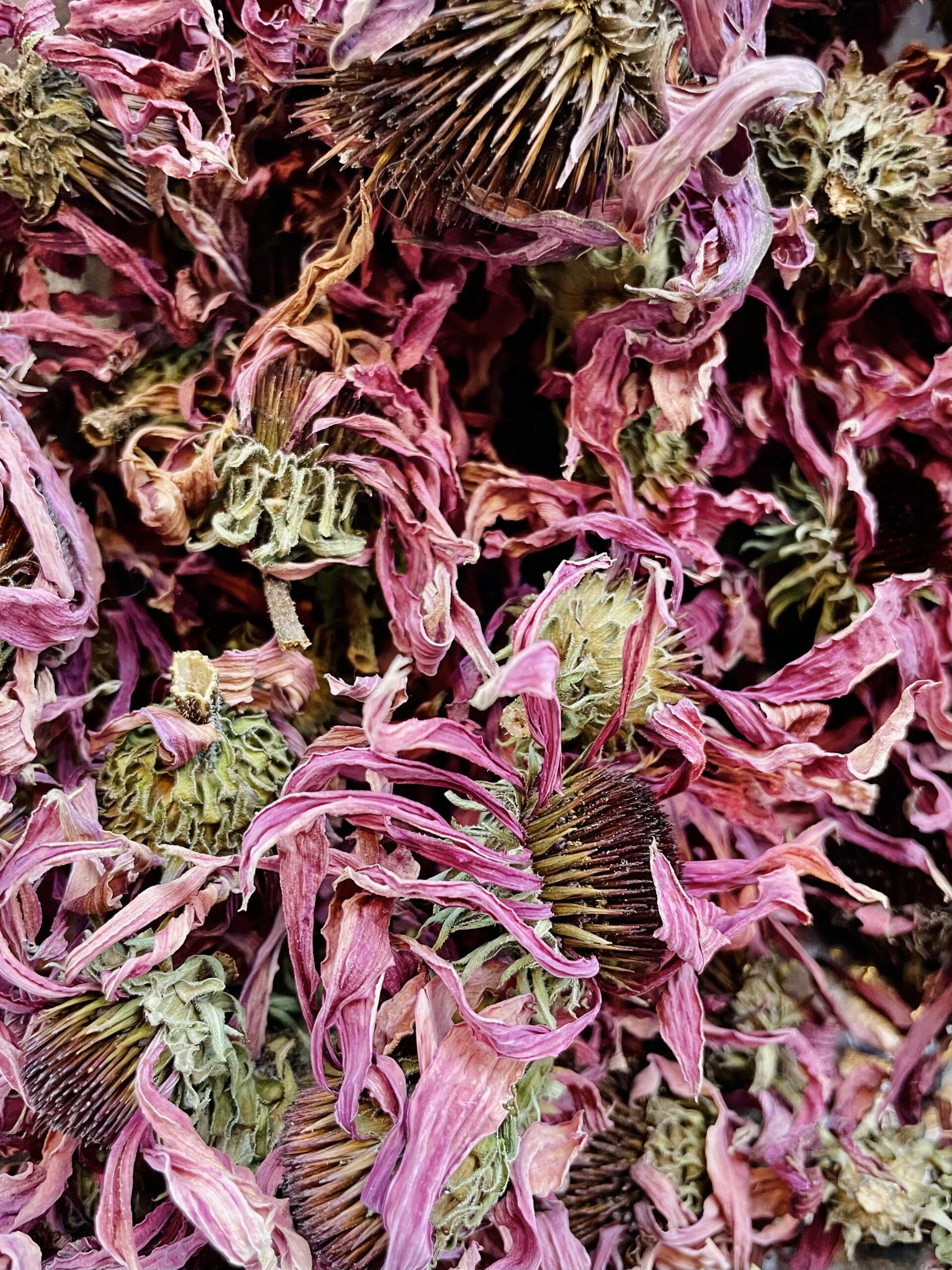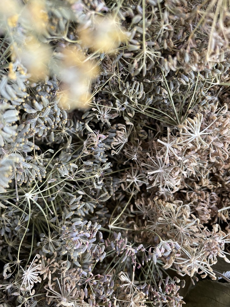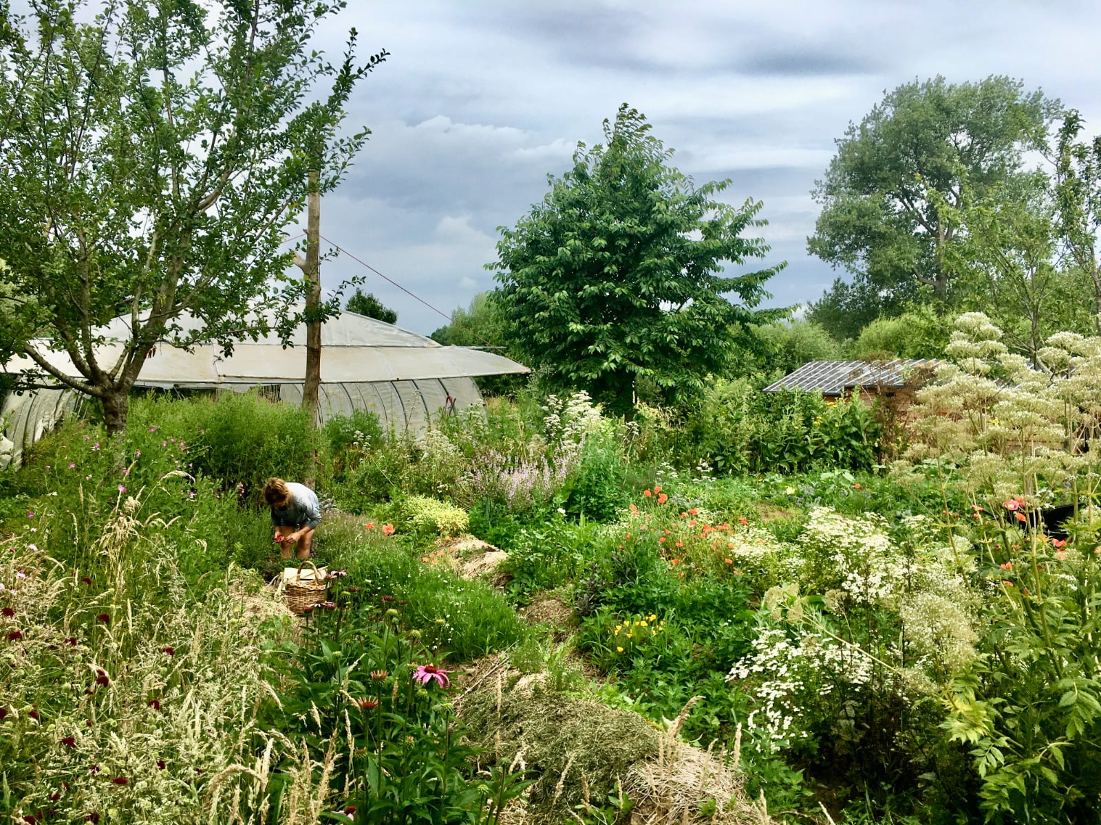 De mars à fin octobre la saison bat son plein. C’est ce que nous expérimentons sur le potager dédié à la récolte de plantes aromatiques et médicinales. Marguerite élabore la culture et son suivi de la graine à la feuille ou fleur mature, entre les semis, le repiquage, l’entretien, la taille, la cueillette, le séchage, l’émondage,…. il y en a pour chaque jour. Le travail est diversifié, fait à la main, à l’aide de sarcloirs, grelinettes, sécateurs et épinettes, de façon naturelle avec pour sources d’inspirations la permaculture, l’agroécolgie et la culture sur sol vivant. Ici pas de phyto, même bio, pas de label non plus, plutôt une attention particulière à l’observation et au maintien d’un écosystème naturel et équilibré. Une fois l’intensité de la belle saison écoulée, viennent les travaux d’automne qui préparent le potager à son hivernage. Il est temps de sortir les stocks secs soigneusement engrangés au long de la saison passée pour vous confectionner des tisanes bienfaisantes.